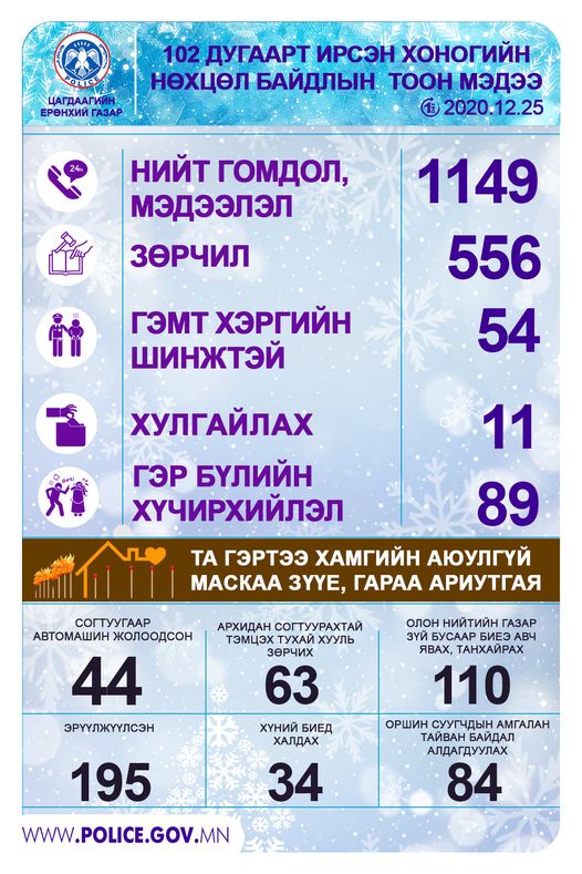 Цагдаагийн байгууллагын 102 дугаарын утсанд өчигдөр нийт 1149 дуудлага, мэдээлэл ирсэн байна. Үүнээс зөрчлийн 556, гэр бүлийн хүчирхийллийн шинжтэй 89, гэмт хэргийн шинжтэй 54 дуудлага мэдээлэл бүртгэгдсэн бол 195 хүн эрүүлжүүлэх байранд хоножээ.