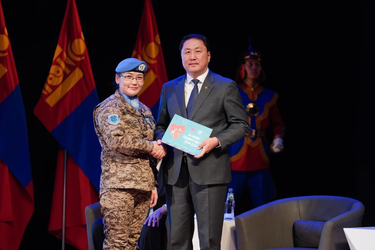 Төр засгийн болон батлан хамгаалах салбарын одон, медалиар шагнагдсан энхийг сахиулагч Та бүхэндээ болон гэр бүл, найз нөхөд, хамт олонд тань чин сэтгэлийн талархал дахин илэрхийлж, эх орноо батлан хамгаалах үйлс нь амжилт бүтээлээр дүүрэн, эрүүл энх, сайн сайхан байхын өлзийтэй ерөөлийг өргөн дэвшүүлье” хэмээн онцлон тэмдэглэв.