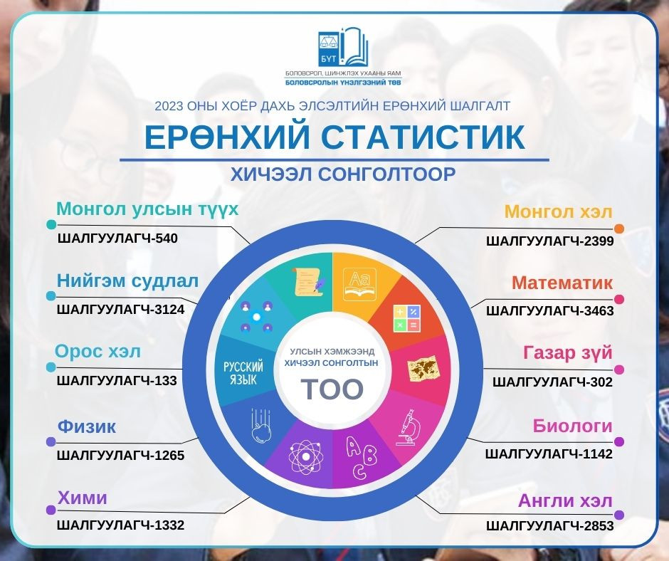 Хичээл сонголтын хувьд математикийн хичээлийн шалгалтыг хамгийн их буюу 3463 шалгуулагч өгөхөөр байна. Харин Орос хэлний хичээлийн шалгалтад 133 суралцагч бүртгүүлсэн байна.