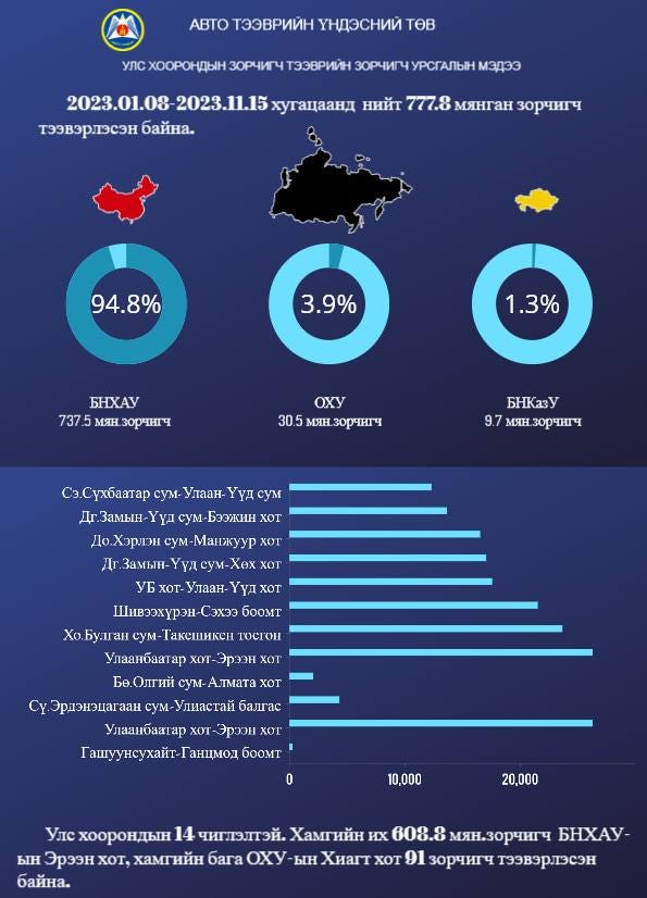 Автотээврийн үндэсний төвөөс улс хоорондын зорчигч тээврийн зорчигч урсгалын мэдээг танилцууллаа. Улс хоорондын зорчигч тээврийн 14 чиглэлтэй бөгөөд 2023 оны нэгдүгээр сарын 8-наас 2023 оны арваннэгдүгээр сарын 15-ны хооронд нийт 777.8 мянган зорчигч тээвэрлэсэн байна.