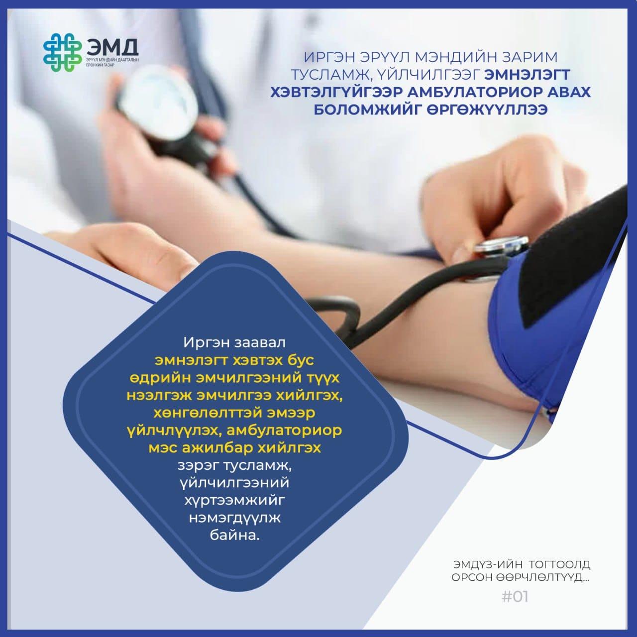 | Иргэн эрүүл мэндийн зарим тусламж, үйлчилгээг эмнэлэгт хэвтэлгүйгээр амбулаториор авах боломжийг өргөжүүллээ |