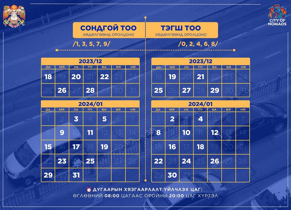 Дугаарын хязгаарлалт ажлын өдрүүдэд 08:00-20:00 цагийн хооронд үргэлжлэх бөгөөд амралтын өдөр үйлчлэхгүй. Автомашины дугаарын тэгш, сондгойгоор зорчих хуваарийг хүргэж байна.