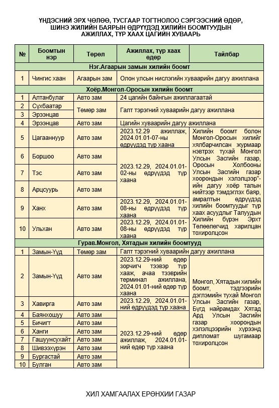 | Шинэ жилээр хилийн боомтуудын амрах хуваарь |