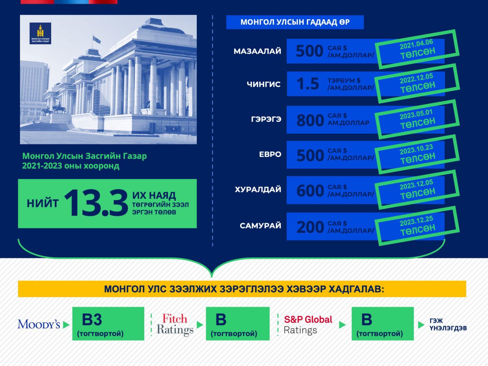 Энэ өр бол улс орны хөгжлийг боомилсон, өрх бүрийн орлогыг хулгайлсан улс орноо дампуурлын ирмэгт хүргэсэн, 12 жилийн алдагдсан боломж гэдгийг хэзээ ч мартаж болохгүй гашуун сургамж юм. Засгийн газар “Чингис” бондын 1.5 тэрбум ам.доллар, “Мазаалай” бондын 500 сая ам.доллар, “Гэрэгэ” бондын 800 сая ам.доллар, “Хуралдай” бондын 430 сая ам.доллар, “Евро” бондын 500 сая ам.доллар, “Самурай” бондын 200 сая ам.долларын өр болон бусад өр төлбөрийг төлөхөд өнгөрсөн хугацаанд 13.3 их наяд төгрөг зарцуулсан байна. Цар тахлын оргил үед Монгол Улсын эдийн засаг -4.7 хувьтай байлаа. Харин 2023 оны урьдчилсан биелэлтээр эдийн засаг 6.8 хувиар өсөж, Дотоодын нийт бүтээгдэхүүн 36.7 их наядаас 63.3 их наяд болж, нэг хүнд ногдох Дотоодын нийт бүтээгдэхүүн 5.220 ам.долларт хүрч, анх удаа улсын төсөв болон төлбөрийн тэнцэл хамтдаа ашигтай гарч байна. Жил хагасын өмнө 2.7 тэрбум доллар байсан гадаад валютын албан нөөц нэмэгдэж, өнөөдрийн байдлаар 4.5 тэрбум ам.долларт хүрээд байна. Бондын энэхүү төлбөрийг хийсэн ч валютын нөөц зорилтот түвшинд хадгалагдаж байна. Цаашид эдийн засгийг нээлттэй, ил тод болгох бодлогоо тогтвортой хадгалж чадвал валютын нөөц 10 тэрбум ам.долларт хүрэх боломж байгааг дуулгахад таатай байна. Өнгөрсөн хугацаанд эдийн засгийн өсөлтийн үр шим өр дарахад зарцуулагдаж байсан бол өнөөдрөөс эхэлж, өрх иргэн бүхэнд хүрэх суурь нөхцөл эдийн засгийн хувьд бүрдэж байна" гэв.