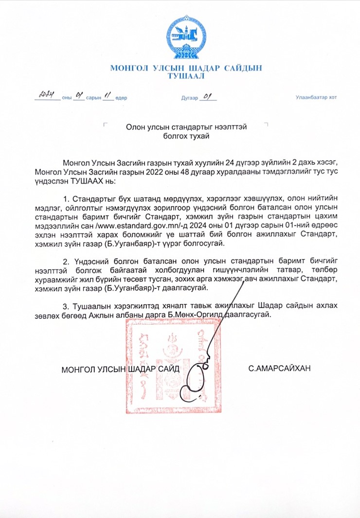 Шадар сайд С.Амарсайханы 2024 оны нэгдүгээр сарын 11-ний өдрийн 01 дүгээр тушаалаар 2024 оны нэгдүгээр сараас Үндэсний болгон нутагшуулж буй Олон Улсын стандартыг олон нийтэд нээлттэй, хүртээмжтэй болгох, сурталчлах, үр ашгийг нэмэгдүүлэх, стандартын талаарх иргэдийн мэдлэг, ойлголтыг нэмэгдүүлэх зорилгоор Монгол Улсад мөрдөгдөж буй MNS, ISO стандартуудын цахим мэдээллийн санг бүх нийтээр нээлттэй харах боломжийг бий болгохыг Стандарт хэмжил зүйн газрын даргын үүргийг түр орлон гүйцэтгэгч Б.Ууганбаярт үүрэг болгосон.