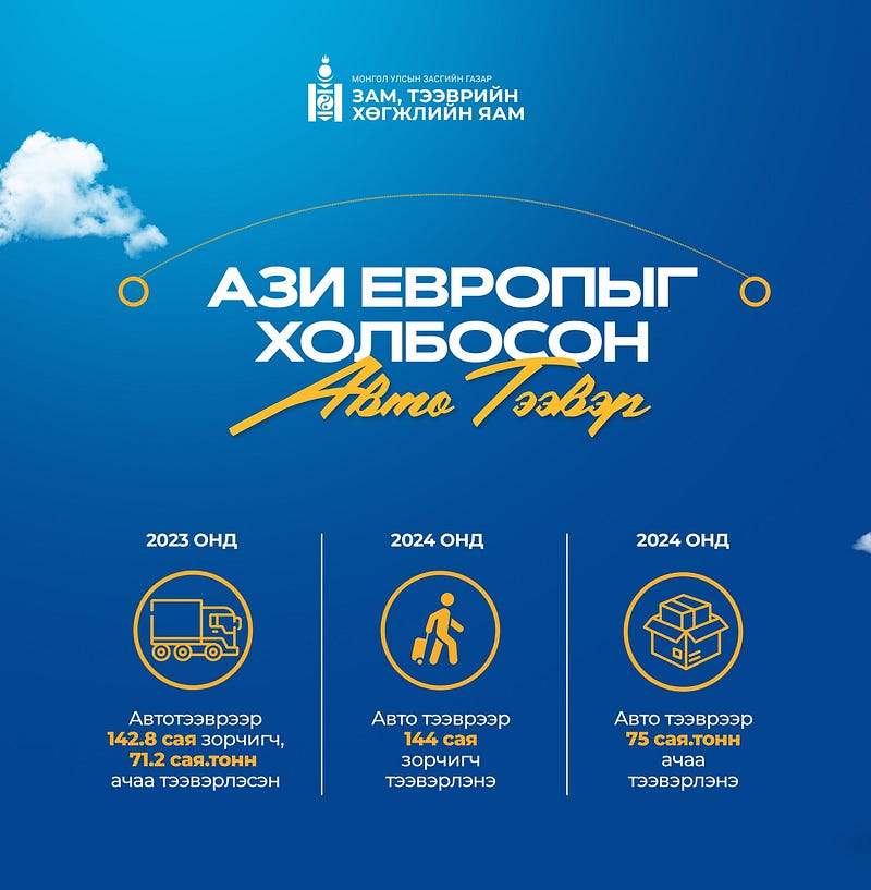Зам, тээврийн хөгжлийн яам 2024 оныг бүсчилсэн хөгжлийг дэмжих бүтээн байгуулалтын жил болгон зарлаж бүх төрлийн тээврээр 147.7 сая зорчигч, 120 сая.тонн ачаа тээвэрлэх зорилт дэвшүүлсэн. Улсын хэмжээнд бүх төрлийн тээврээр 2024 оны нэгдүгээр сард 11.5 сая зорчигч тээвэрлэлээ. Мөн хугацаанд бүх төрлийн тээврээр 10.2 сая.тонн ачаа тээвэрлэсэн нь өмнөх оны мөн үетэй харьцуулахад 54 хувиар өссөн үзүүлэлттэй байна.