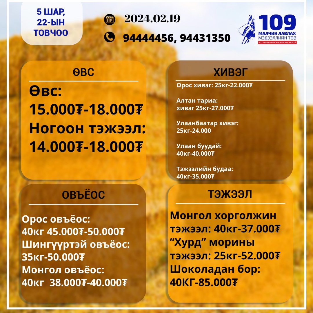 Орон нутагт хаваржилт хүндэрч, цасан шуурганы улмаас мал муудаж, ихээр хорогдож байгаа. Тэгвэл энэ хэцүү цаг үед өвс, тэжээл хомсдож, үнэ өсдөг. Өчигдрийн байдлаар ХХААХҮЯ-ны харьяа “Малчин лавлах-109” мэдээллийн төвийн мэдээллээр “22-ын товчоо”, “Таван шар” орчимд өвс 15-18 мянган төгрөг, ногоон тэжээл 14-18 мянган төгрөг, орос хивэг 22-25 мянга, Алтан тариа 25-27 мянга, Улаанбаатар хивэг 24-25 мянган төгрөг, тэжээлийн будаа 35-40 мянган төгрөгийн үнэтэй байв. Харин орос овъёос 40 килограммтай нь 45-50 мянга, шингүүртэй овъёос 35-50 мянган төгрөг, монгол овъёос 38-40 мянган төгрөгийн үнэтэй байв. Мөн хорголжин 35 мянга, “Хурд” морины тэжээл 52 мянга, школадан бор 85 мянган төгрөгийн үнэтэй байна.