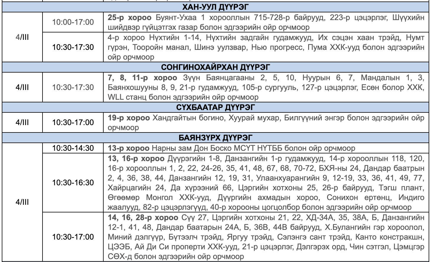 Өнөөдөр буюу гуравдугаар сарын 4-ний өдөр дараах байршилд цахилгааны хязгаарлалт хийх хуваарьтай байна.