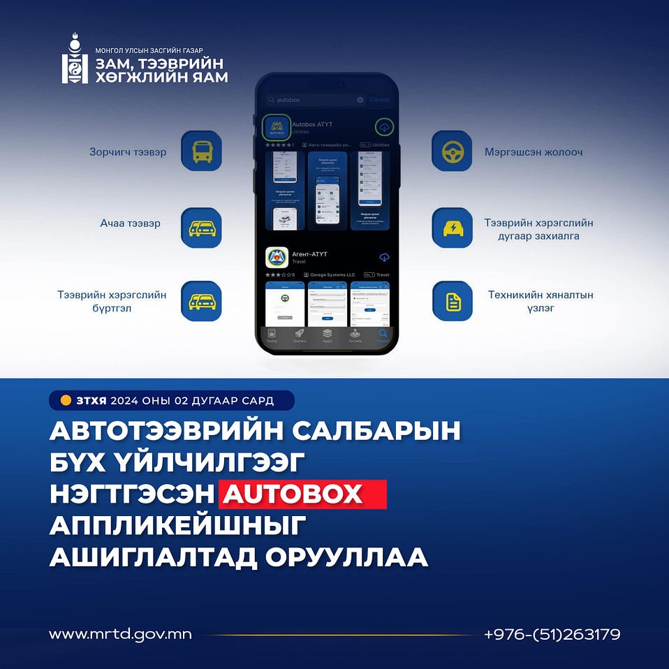 Autobox аппликейшн нь тээврийн хэрэгслийн шилжилт хөдөлгөөнийг тоон гарын үсэг дээр суурилан шилжүүлэх боломжийг бүрдүүллээ. Autobox аппликейшнаас одоогоор нийт зургаан төрлийн үйлчилгээ, дөрвөн төрлийн лавлагааг авах боломжтой. Зорчигч тээврийн тасалбар, техникийн хяналтын үзлэгийн цаг захиалах, мэргэшсэн жолоочийн шалгалтаа цахимаар өгнө.