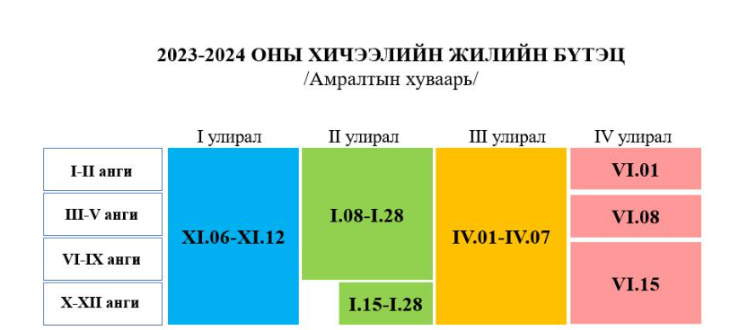 Сурагчдын өвлийн амралт гурван долоо хоног үргэлжлээд нэгдүгээр сарын 19-нөөс хичээл орсон билээ. Хичээлийн шинэ жилийн эхэнд тухайн хичээлийн жилийн бүтцийг боловсрол, шинжлэх ухааны сайд баталдаг. БШУ-ы сайд Л.Энх-Амгалан 2023 оны наймдугаар сарын 23-ны өдрийн А/388 дугаар тушаалаар хичээлийн жилийн бүтцийг шинэчлэн баталсан ба уг хуваарийн дагуу хичээллэж буй юм.