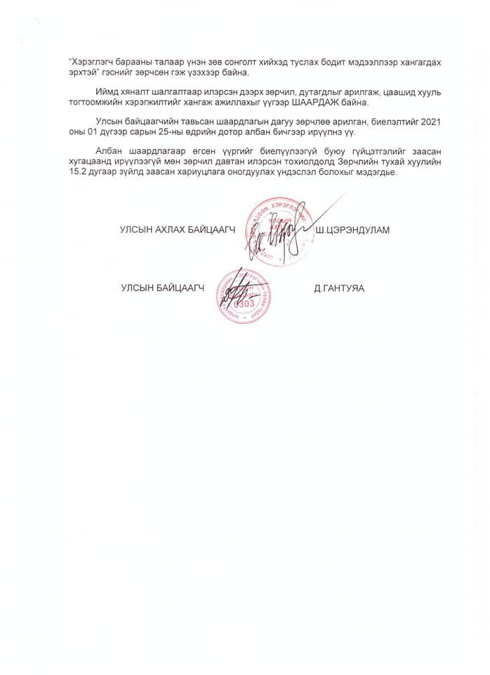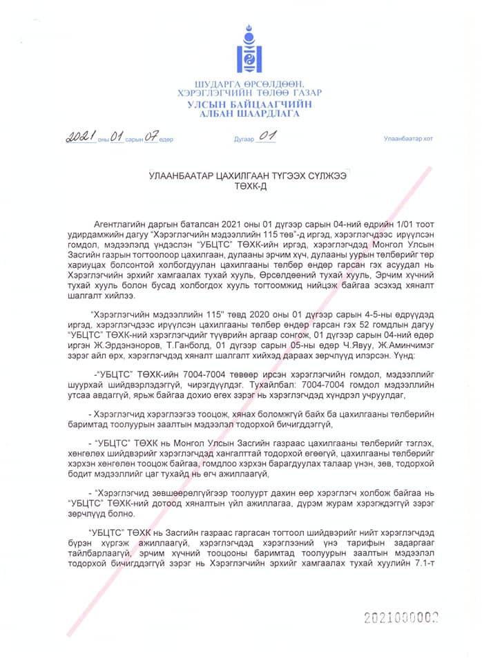ШӨХТГ-аас цахилгааны төлбөр өндөр гарсан тухай асуудал нь холбогдох хууль тогтоомжид нийцэж байгаа эсэхэд шалгалт хийжээ. Хяналтаар дараах зөрчлүүд илэрсэн бөгөөд "Улаанбаатар цахилгаан түгээх сүлжээ" ТӨХК-д Улсын байцаагчийн АЛБАН ШААРДЛАГА хүргүүлсэн байна.