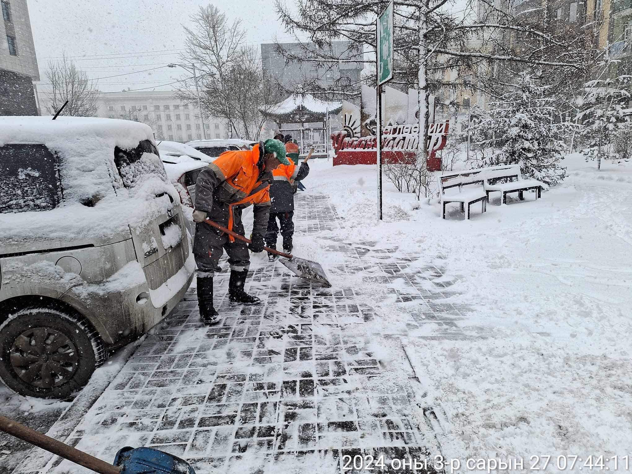 Чингэлтэй дүүргийн цэвэрлэгээ үйлчилгээ хариуцсан хоёр байгууллагын 100 гаруй ажилтан тусгай зориулалтын зургаан автомашин, нэг экскавор, нэг автогрейдэр, хоёр ковш, хоёр шүүрдэгчтэйгээр ажиллаж, 25 тонн бодис, таван тонн давс цацжээ. Баянзүрх дүүргийн цэвэрлэгээ үйлчилгээ хариуцсан гурван байгууллагын 205 орчим ажилтан давс бодис цацагч, шүүрдэгч, хусагч, цас тээвэрлэх тээврийн хэрэгсэл зэрэг нийт 40 техник хэрэгсэлтэйгээр ажиллаж, нийт 230 км урт авто замд 40 тонн бодис цацаад буй.