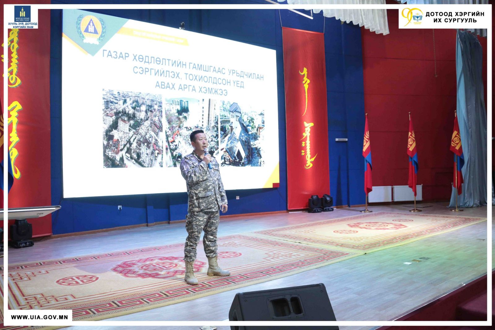 Дотоод хэргийн их сургуулийн Онцгой байдлын сургуулиас газар хөдлөлтийн гамшгийн аюулаас урьдчилан сэргийлэх, эрсдэлийг бууруулах, бэлэн байдлыг хангах, аврах үйл ажиллагаанд хүн амыг сургаж бэлтгэх зорилгоор “Газар хөдлөлтийн аюулаас урьдчилан сэргийлэх, таниулах өдөр"-ийг тохиолдуулан танхимын сургалт зохион байгууллаа.