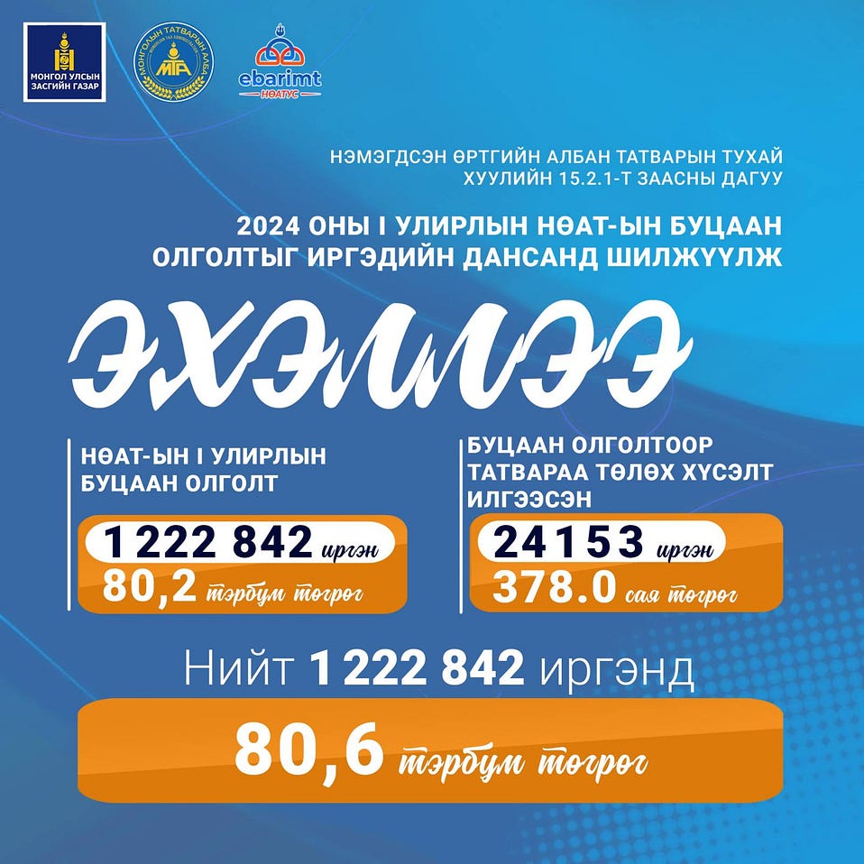 | 2024 оны нэгдүгээр улирлын НӨАТ-ын урамшууллын буцаан олголтыг шилжүүлж эхэллээ |