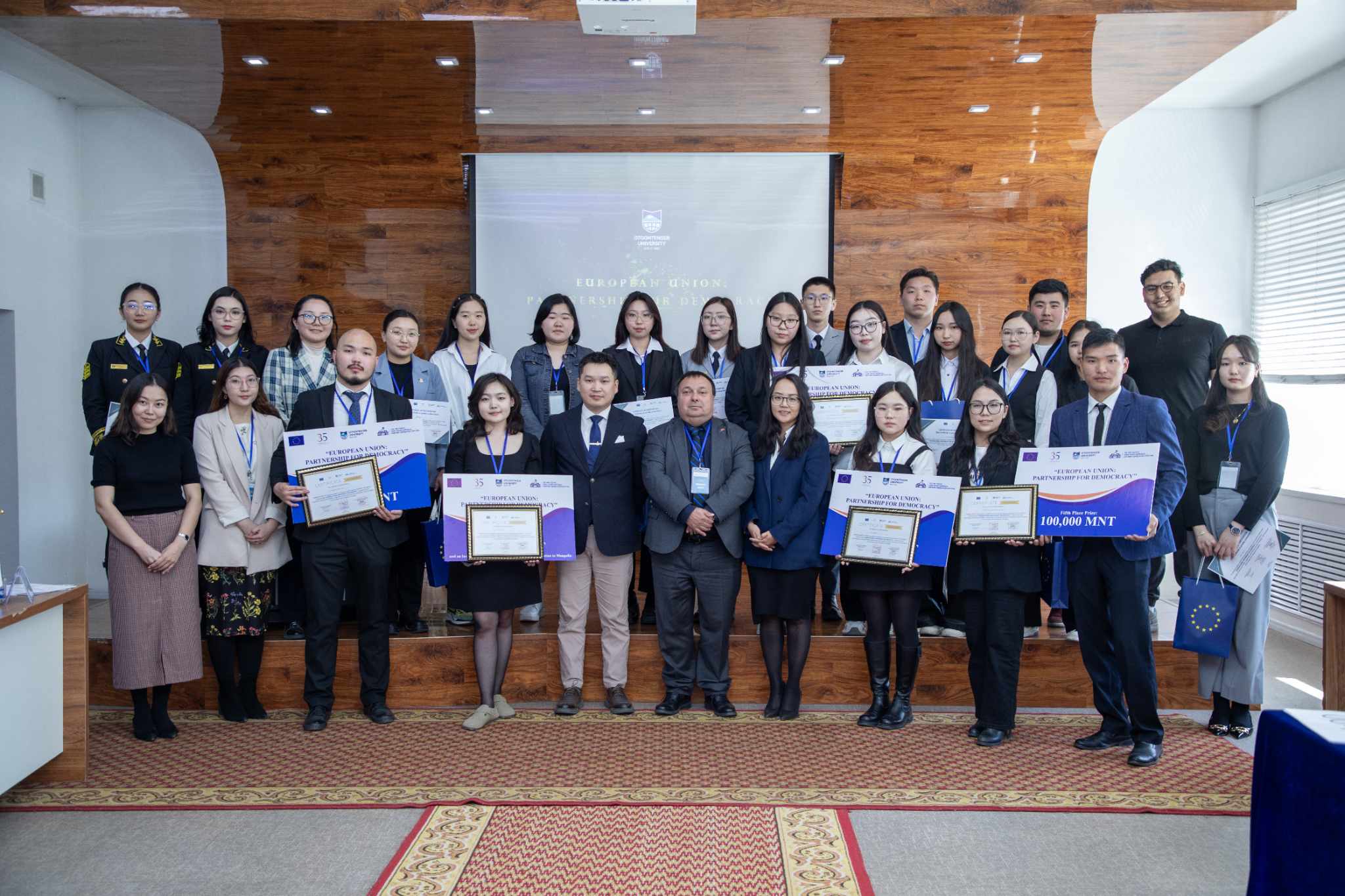 Нэгдүгээр байр: МУИС-ийн олон улсын харилцааны 3-р түвшний оюутан Э.Энхзаяа: “Promoting Democracy In Mongolia With The European Union's Support And Its Effectiveness” сэдвээр