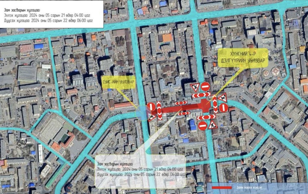 Сүхбаатар болон Чингэлтэй дүүргийн нутаг дэвсгэр, СУИС-ийн уулзварын зүүн талаас хүнсний 4 дүгээр дэлгүүрийн уулзварын зүүн тал хүртэлх авто замыг тавдугаар сарын 21-ний 04:00 цагаас тавдугаар сарын 22-ны өдрийн 06:00 цагийн хооронд хааж, шинэчилнэ.
