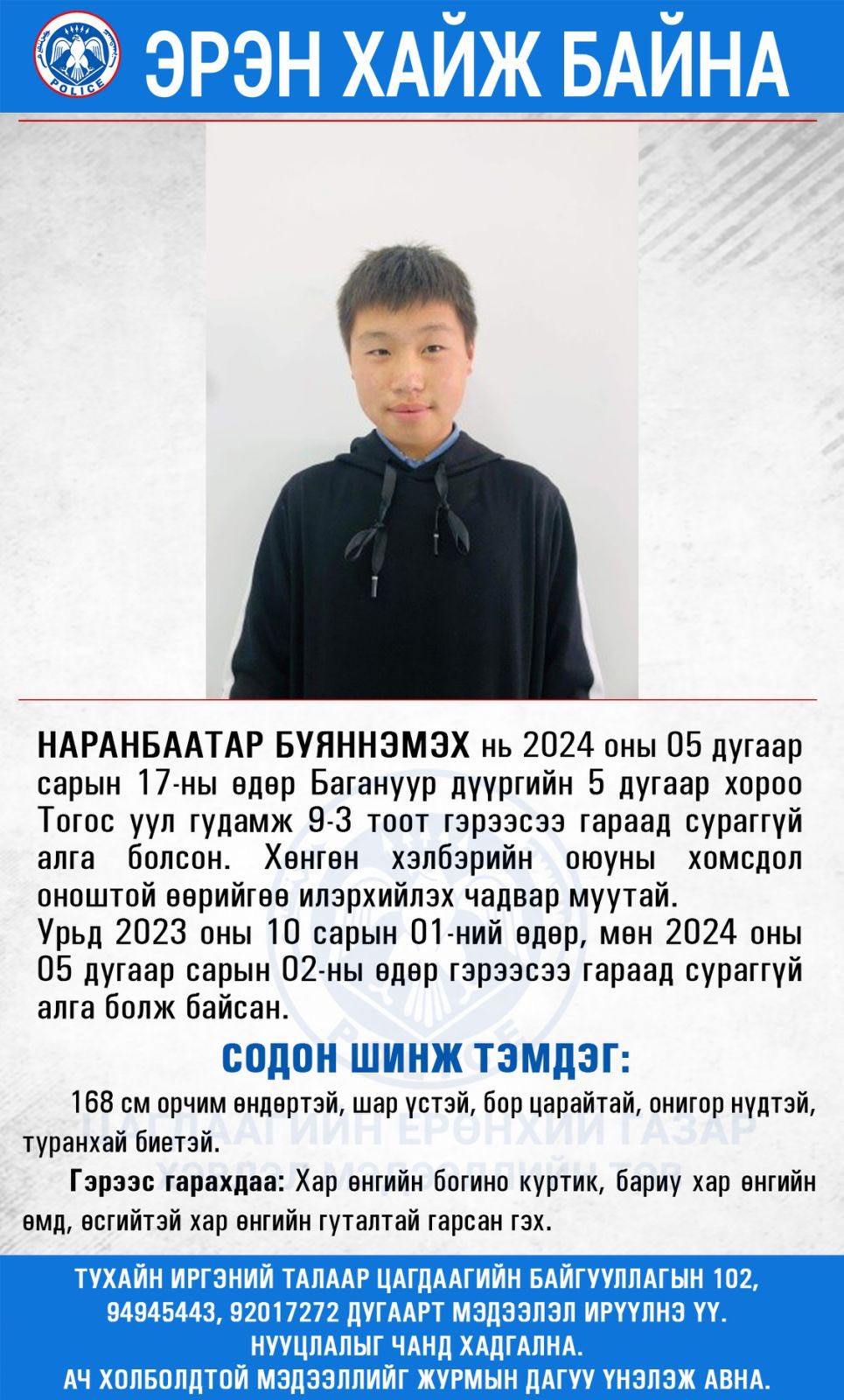 Та бүхэн ЦЕГ-ын 102 тусгай дугаар, 94945443 болон 92017272 дугааруудад мэдээлэл ирүүлж хамтран ажиллана уу.