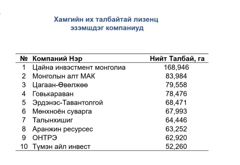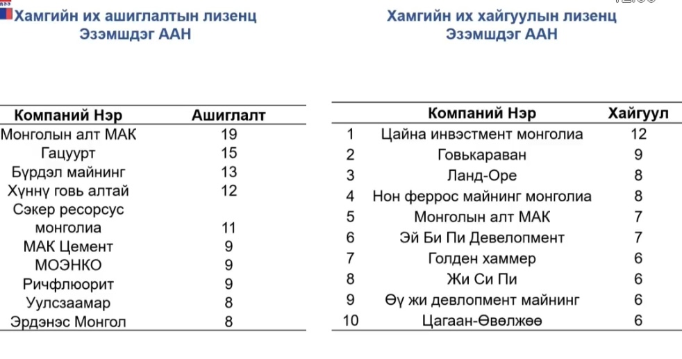Энэ үеэр шинжээч "Ашигт малтмалын олголттой холбоотой тухайн он цагт ажиллаж байсан байгууллага, удирдлагуудын мэдээлэл байна. Тухайлбал, 2004 онд Лу.Болд, 2008 онд Ж.Билэгсайхан, 2009 онд Д.Батхуяг, Д.Амарсайхан, 2012 онд Г.Алтансүх, Г.Өлзийбүрэн, 2014 онд Д.Үүрийнтуяа, 2016 онд Б.Баатарцогт, 2017 онд Х.Хэрлэн, 2022 оноос Л.Баярмандал нар ажиллаж байсан байна. 1992 оноос хойш өнөөдрийг хүртэл Монгол Улсын нийт нутаг дэвсгэрийн долоон сая га газарт нийт 14876 ашигт малтмалын олголт хийгдсэн байгаагаас 12019 нь хайгуул, 2858 нь ашиглалтын зөвшөөрлийг олгосон байна. Тэгвэл хамгийн их талбайтай лиценз эзэмшдэг 10 компанийг танилцуулж байна.