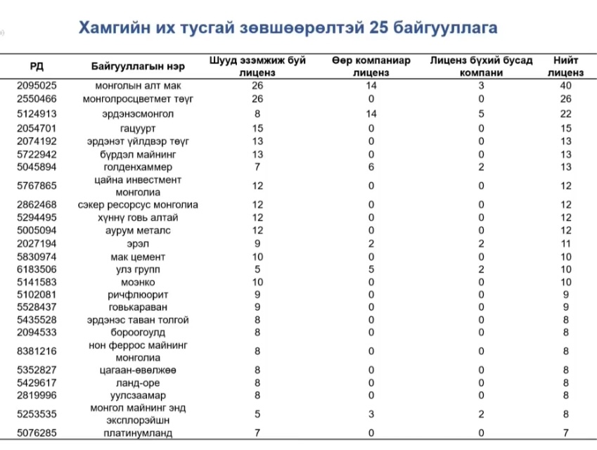 Мөн нэг компанид хамгийн их лиценз эзэмшиж байгаа 25 байгууллагын мэдээллийг хүргэж байна.