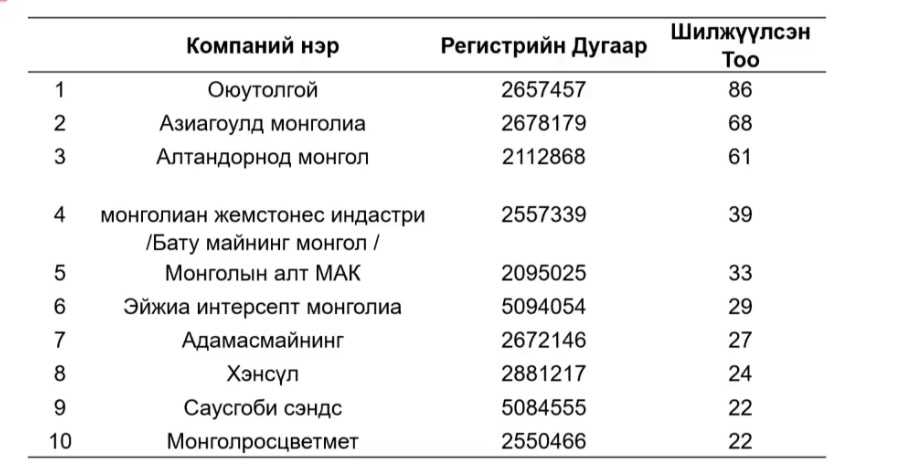 Ашигт малтмалын олголттой холбоотойгоор тусгай зөвшөөрөл шилжүүлэг хийсэн статистик, шилжүүлсэн тусгай зөвшөөрлийн тоогоор, "Оюултолгой" ХХК 86, "Азиагоулд монголиа" ХХК 68, "Алтан дорнод Монгол" ХХК 61 удаа зөвшөөрөл авсан байна. Мөн зөвшөөрөл авсан компаниудыг дорж танилцуулж байна.