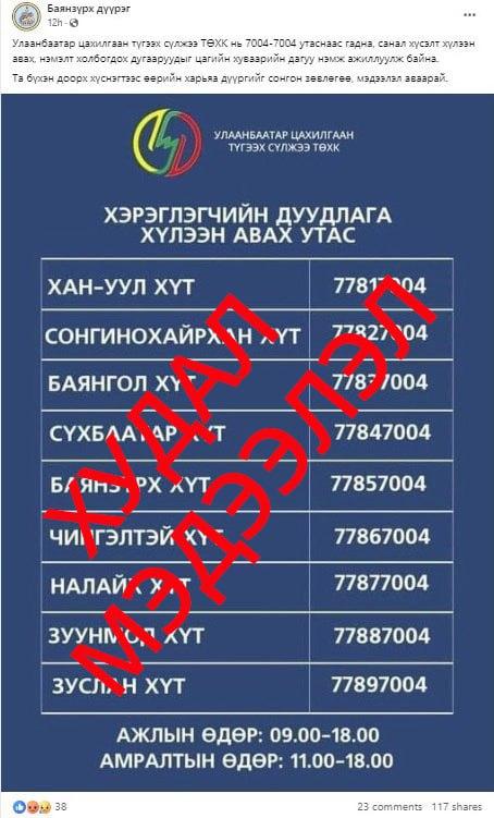 Сүүлийн өдрүүдэд олон нийтийн цахим сүлжээгээр “Улаанбаатар цахилгаан түгээх сүлжээ ТӨХК нь 70047004 утаснаас гадна, санал хүсэлт хүлээн авах, нэмэлт холбогдох дугааруудыг цагийн хуваарийн дагуу нэмж ажиллуулж байна” гэдэг ташаа мэдээлэл гарч иргэдийг төөрөгдүүлж, бухимдал үүсгэж байна.