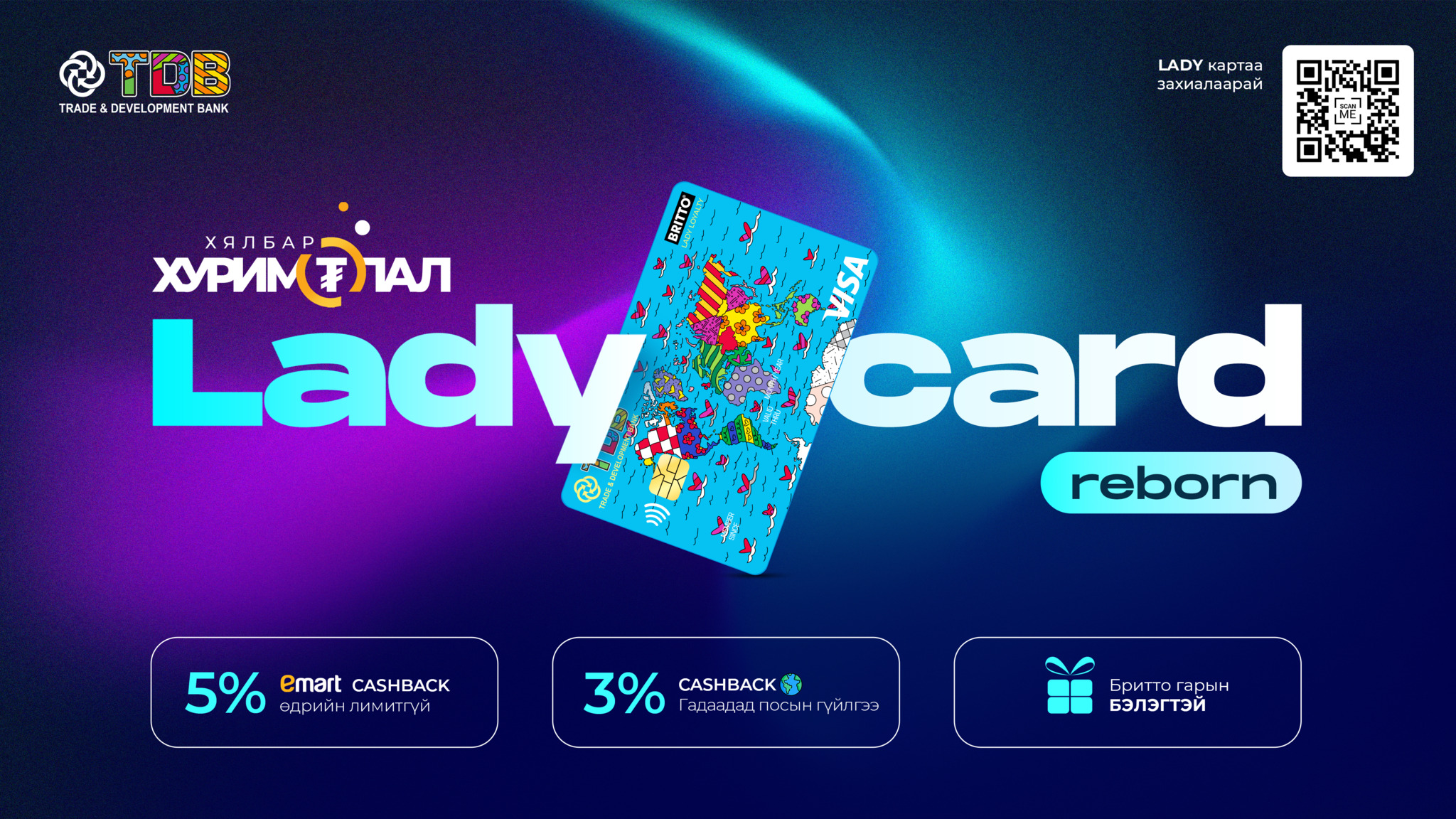 Britto Lady карт хуримтлуулдаг болж 2024.04.01 -с хойш захиалсан картаараа Emart -с худалдан авалт хийхдээ TDB POS дээр уншуулаад өдрийн лимитгүй 5% cashback, мөн дэлхийн хаана ч дурын пос дээр уншуулаад 3% cashback -тайгаар шинэчлэгдсэн.