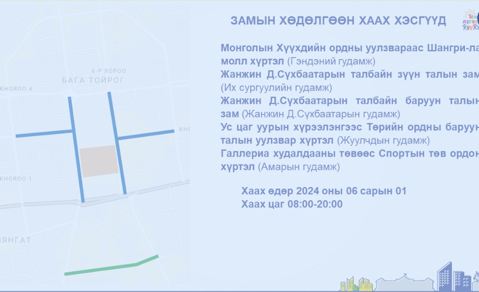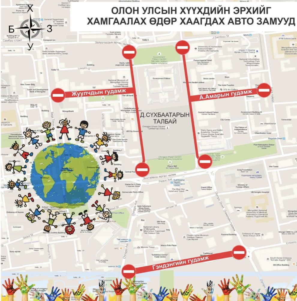 Олон улсын хүүхдийн эрхийг хамгаалах өдрийг тохиолдуулан нийслэлийн Засаг даргын захирамжийн дагуу өнөөдөр дараах чиглэлийн авто замын хөдөлгөөнийг хязгаарлана.