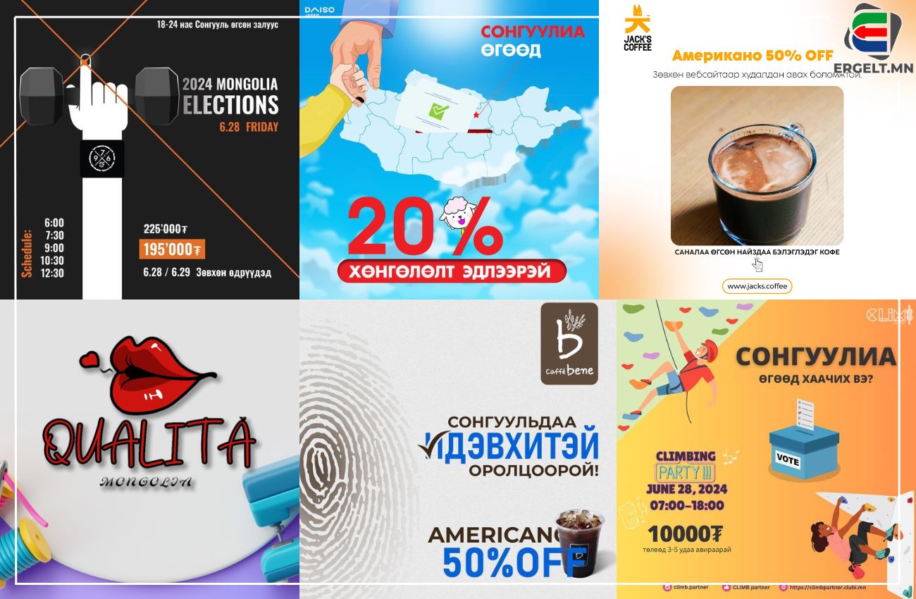 Монгол Улсын УИХ-ын сонгууль орон даяар үргэлжилж байна Санал хураалт өнөөдөр 22:00 цагт дуусна. ААН-үүдээс сонгуулийн идэвхийн нэмэгдүүлэх, сонголтоо хийсэн иргэдийг урамшуулах зорилгоор сонгуулиа өгсөн тэмдгээ харуулаад бүтээгдэхүүн хөнгөлөлттэй авах эрх олгодог билээ. Тэгвэл бид сонгуулиа өгсөн иргэдийн хөнгөлөлт эдлэх боломжтой газруудыг танилцуулж байна.