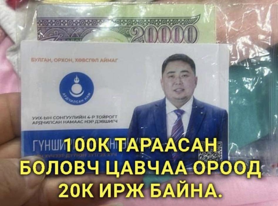Булган, Орхон, Хөвсгөл аймагт Ардчилсан намаас нэр дэвшиж байаа Г.Мөнгөнхуягийг Булган аймгийн иргэдэд мөнгө тараасан гэх мэдээлэл олон нийтийн сүлжээгээр цацагдсан. Энэ талаар Булган аймгийн Засаг дарга буюу тус аймгийн Ардчилсан намын дарга Б.Ариун-Эрдэнээс тодрууллаа.