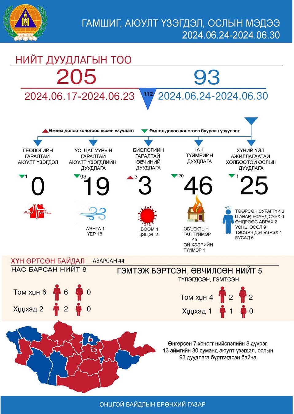 Өнгөрсөн долоо хоногт нийслэлийн найман дүүрэг, 13 аймгийн 30 суманд аюулт үзэгдэл, ослын 93 удаагийн дуудлага бүртгэгдлээ. Дуудлагын дагуу төв, орон нутгийн Онцгой байдлын байгууллагын алба хаагчид үүрэг гүйцэтгэж, 44 иргэний амь насыг авран хамгаалсан. Харин гамшиг, аюулт үзэгдлийн улмаас 8 хүн нас барж, 5 хүн гэмтэж бэртсэн байна.