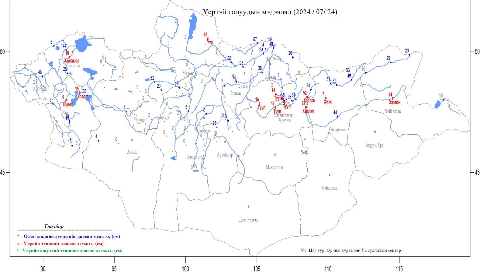 Хэнтий нурууны баруун хажуугийн Ерөө, Туул /Алтанбулаг/, зүүн хажуугийн Хурх, Барх, Эг, Онон, Хэрлэн /Мөнгөнморьт-Багануур/зэрэг голуудын усны түвшин 10-45 см нэмэгдэж, Туул /нийт уртын дагуудаа/, Хэрлэн /эх болон адаг хэсгээрээ/, Хурх, Үүр зэрэг голууд үерийн түвшинг 10-50 см даван үерлэж байна. Түүнчлэн Алтай нуруунаас эхтэй Буянт, Ховд, Увс нуурын савын Хархираа гол үерийн түвшинг 10-15 см давсан хэвээр байна.