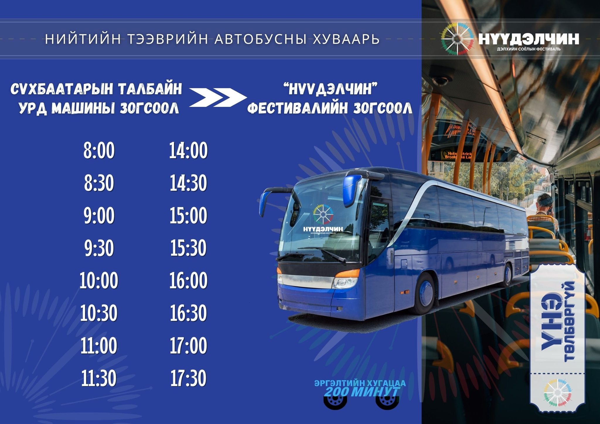 Фестивальд ирэх болон буцах иргэд, жуулчдад зориулсан нийтийн тээвэр дараах хуваарийн дагуу үнэ төлбөргүй үйлчилж байна. Та бүхэнд Сүхбаатарын талбайгаас болон"Нүүдлчин" фестивалийн зогсоолоос үйлчлэх автобусны цагийн хуваарийг хүргэж байна.