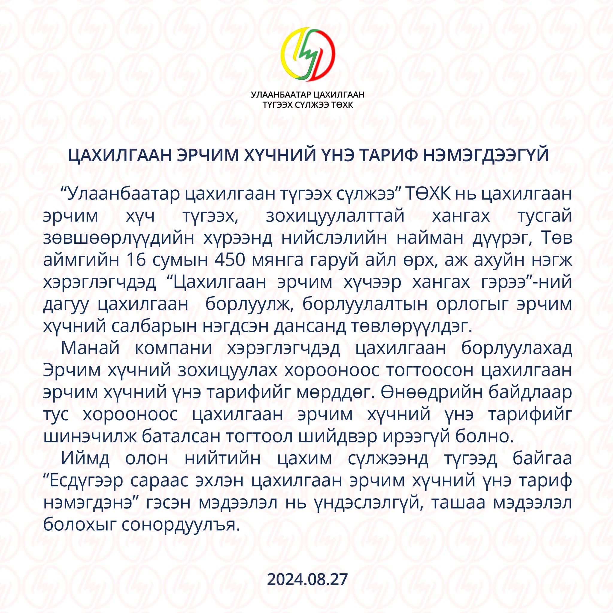| "Есдүгээр сараас эхлэн цахилгаан эрчим хүчний үнэ тариф нэмэгдэнэ” гэсэн нь ташаа мэдээлэл |