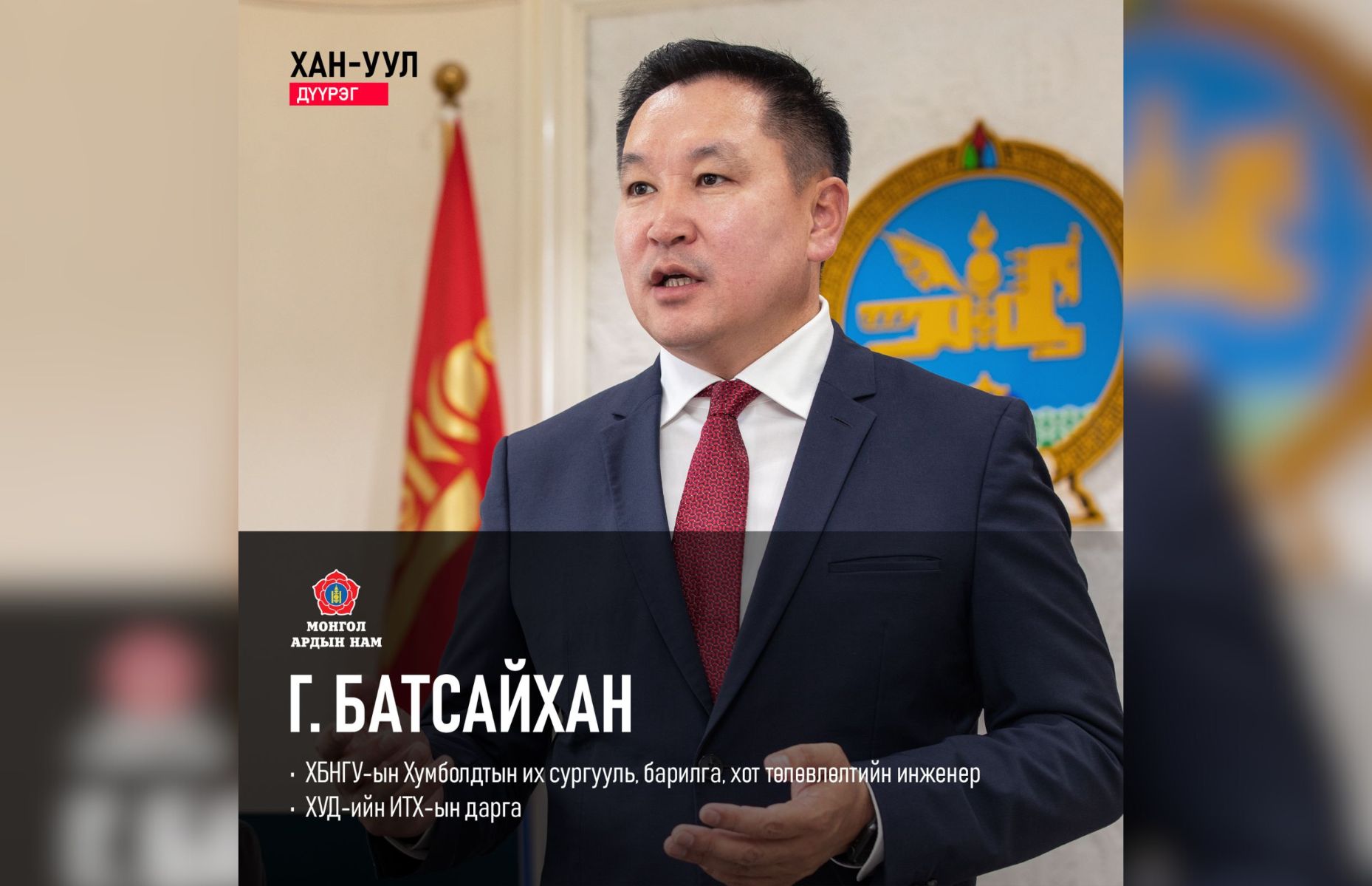 Хан-Уул дүүргийн ИТХ-ын дарга, нэр дэвшигч Г.Батсайханы тухайд ХБНГУ-ын Хумбольдтын Их сургуулийг хот төлөвлөлт, барилгын инженерээр төгссөн байна. Салбартаа ажиллаж байсан өндөр туршлагатай. Мөн төрийн албанд зүтгэснээс хойш Хан-Уул дүүргийн төлөвлөлт, хөгжлийг инженерийн арга ухаан дээр тулгуурлаж авч явахыг эрмэлзсээр ирснийг харж болох аж.