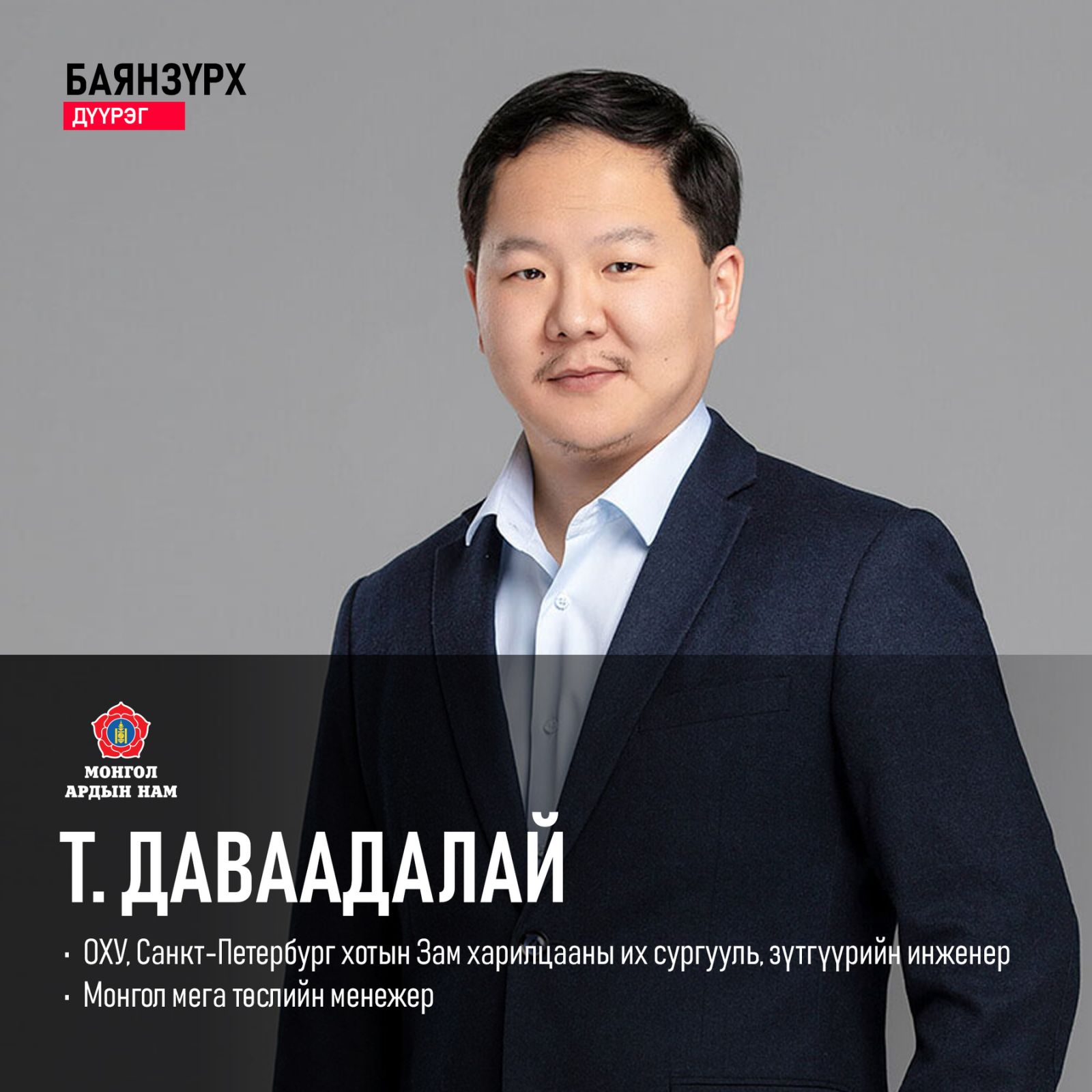 Баянзүрх дүүрэгт Т.Даваадалайг сойж байна. “Тавантолгойн нүүрс ачих логистикийн төв”-ийн төслийн захирлаар ажилладаг. ОХУ-ын Санкт-Петербург хотын Зам харилцааны их сургуулийг төгсөж, зүтгүүрийн инженер мэргэжил эзэмшжээ.