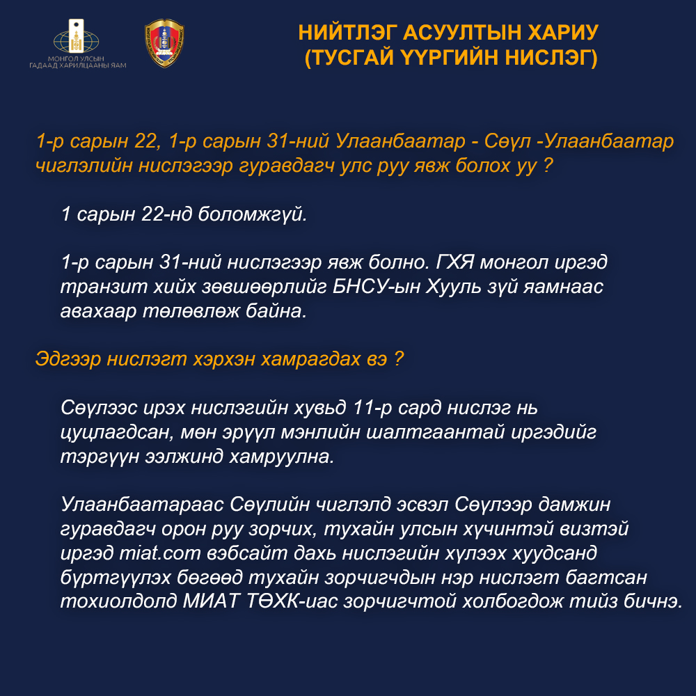 Харин Улаанбаатараас Сөүлийн чиглэлд, эсвэл Сөүлээр дамжин гурав дахь орон руу зорчих, тухайн улсын хүчинтэй визтэй иргэд miat.com вэб сайт дахь нислэг хүлээх хуудсанд бүртгүүлэх бөгөөд тухайн зорчигчийн нэр нислэгт багтсан тохиолдолд МИАТ ТӨХК-аас зорчигчтой холбогдож тийз бичнэ гэж УОК-ын Шуурхай штабаас мэдээллээ.