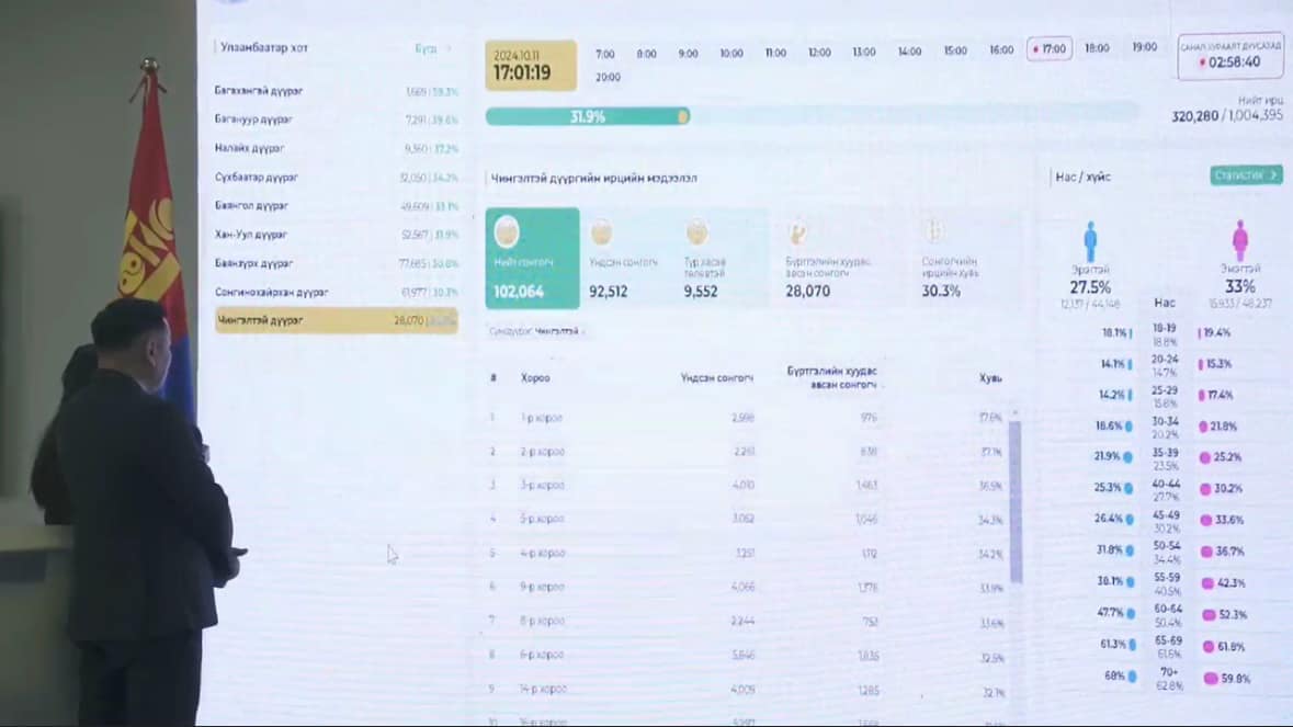 Улсын хэмжээнд нийт сонгогчдын тоо 2.105.373 бөгөөд 140.790 нь “Түр хасав” төлөвтэй. 15.38 цагийн байдлаар нийт сонгогчдын 36.6 хувь нь саналаа өгөөд байна.