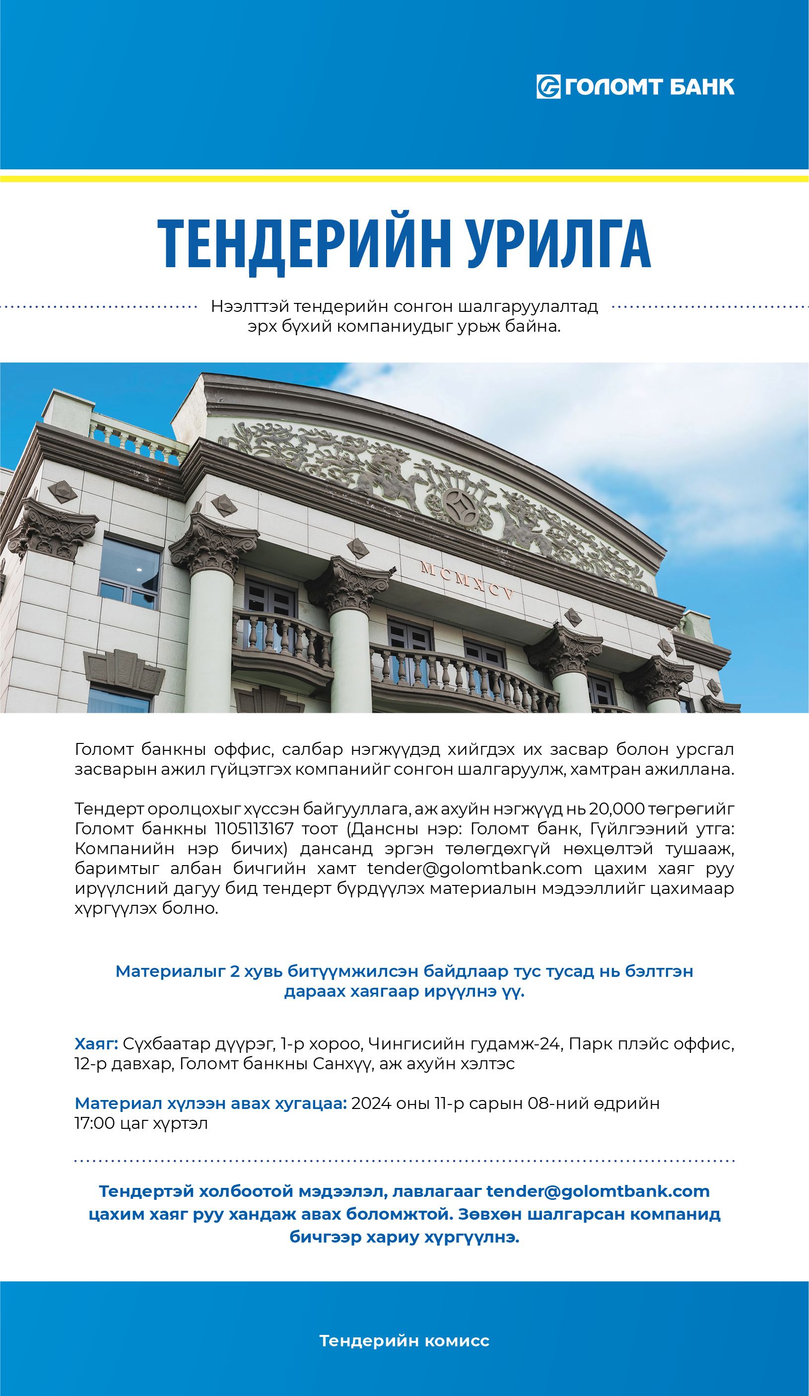 | Голомт банк: ТЕНДЕРИЙН УРИЛГА |