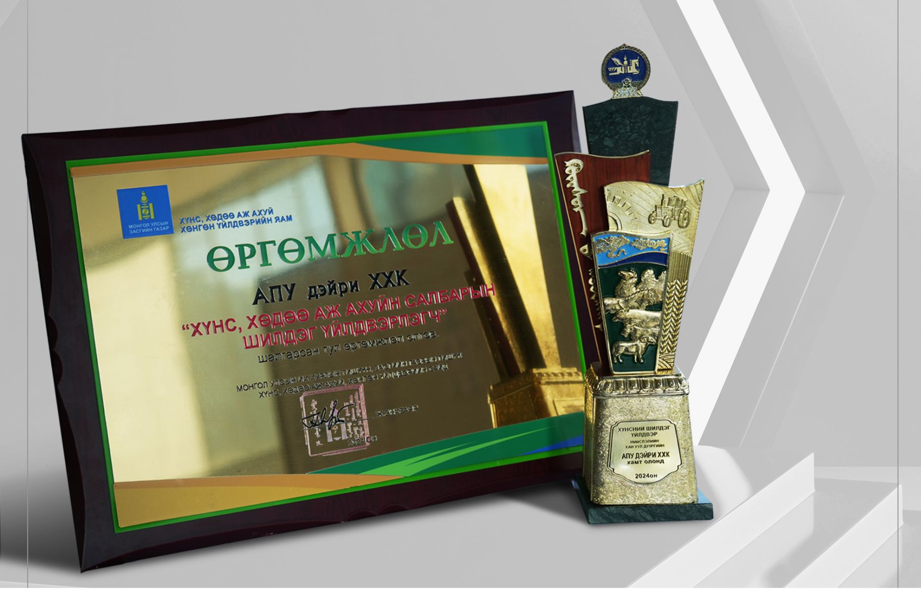"Хүнсний хангамж, аюулгүй байдлыг хангах талаар авах зарим арга хэмжээний тухай" Улсын Их Хурлын 36 дугаар тогтоолыг хэрэгжүүлэх төлөвлөгөөнд Хүнс, хөдөө аж ахуйн салбарын шилдэг үйлдвэрлэгчийг жил бүр шалгаруулж урамшуулахаар заасан байдаг. “Хүнсний хувьсгал” үндэсний хөдөлгөөн, “Алтан намар-2024” баярын хурлаар Хүнс, хөдөө аж ахуйн салбарын шилдэг 10 үйлдвэрлэгчийг бүс бүрээс шалгаруулсан бөгөөд Төвийн бүсээс тэр дундаа Улаанбаатар хотод үйл ажиллагаа эрхэлдэг нийт хүнсний үйлдвэрүүд дундаас шилдэг үйлдвэрлэгчээр АПУ ДЭЙРИ-Монгол сүүний үйлдвэр шалгарлаа.