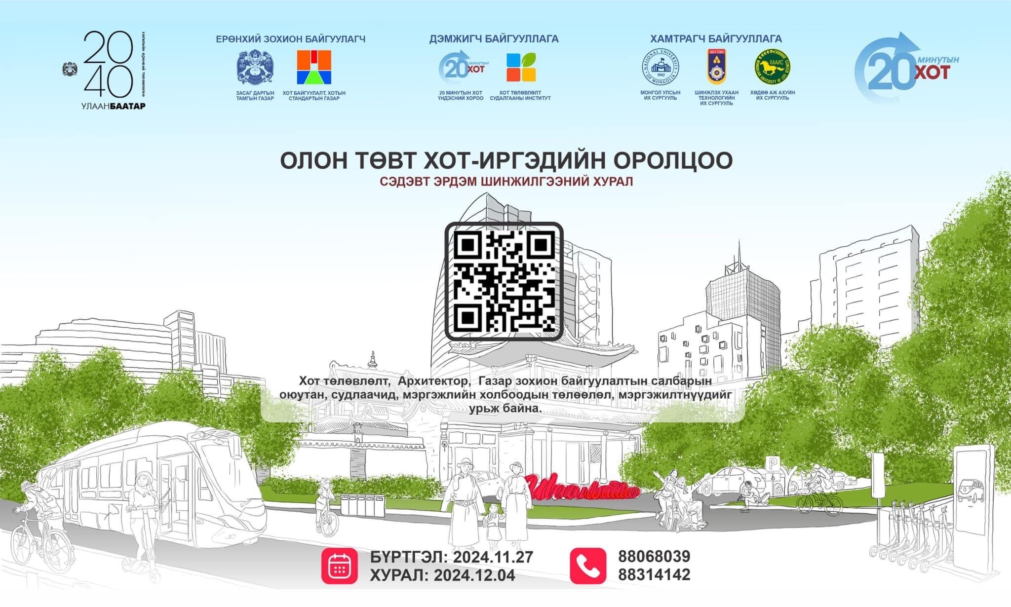 Улаанбаатар хот 2040 оны хөгжлийн ерөнхий төлөвлөгөөгөө боловсруулж буй. Түүнчлэн 20 минутын хот, авто замын түгжрэлийг бууруулах шийдэл болон олон төвт хотын тогтолцоонд салбарын хүмүүсийг татан оролцуулах зорилготойгоор их, дээд сургуулийн хот төлөвлөлт, архитектур, газар зохион байгуулалтын салбарын оюутан, судлаачид, мэргэжлийн холбоодын хүрээнд “Олон төвт хот-иргэдийн оролцоо” сэдэвт эрдэм шинжилгээний хурлыг зохион байгуулахаар боллоо. Эрдэм шинжилгээний хурал арванхоёрдугаар сарын 4-ний өдөр 10:00 цагт нийслэлийн Нутгийн захиргааны төв цогцолбор байранд болно.