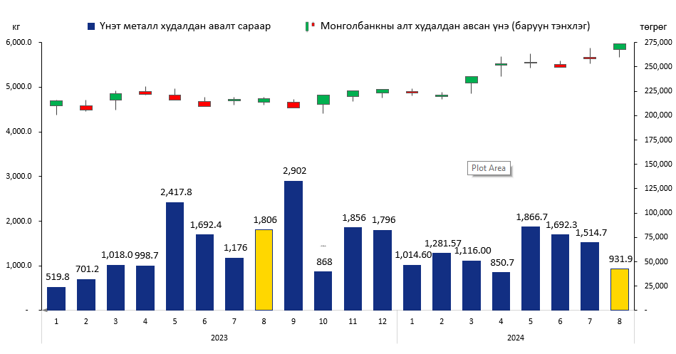 Монголбанк 2024 оны 8 дугаар сард 931.9 кг үнэт металл худалдан авч, оны эхнээс өссөн дүнгээр 10.3 тонн үнэт металл худалдан аваад байна. Энэ нь өмнөх оны мөн үетэй харьцуулбал 1.6 хувиар буурсан үзүүлэлт байна.