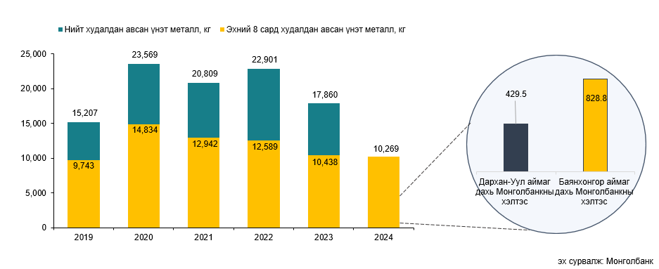 Оны эхнээс өссөн дүнгээр Дархан-Уул аймаг дахь Монголбанкны хэлтэс 429.5 кг, Баянхонгор аймаг дахь Монголбанкны хэлтэс 828.8 кг үнэт металл тус тус худалдан авсан байна.