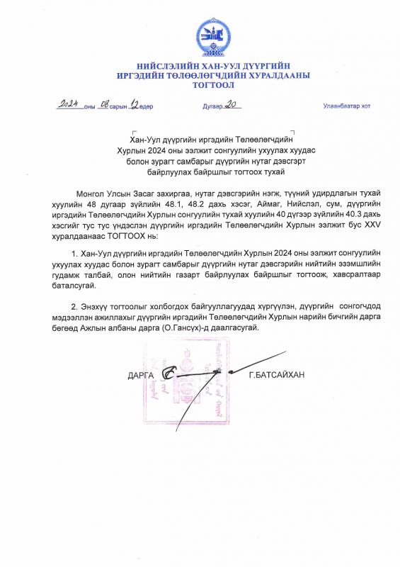 | Хан-Уул дүүргийн иргэдийн Төлөөлөгчдийн Хурлын 2024 оны ээлжит сонгуулийн ухуулах хуудас болон зурагт самбарыг дүүргийн нутаг дэвсгэрт байрлуулах байршлыг тогтоох тухай |
