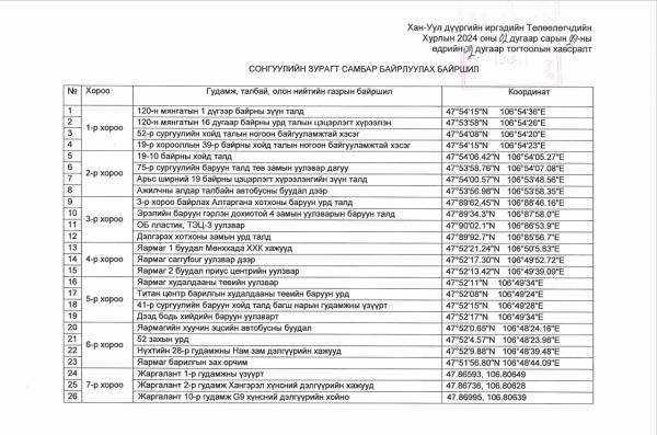 | Хан-Уул дүүргийн нутаг дэвсгэрт Улсын Их Хурлын сонгуулийн зурагт самбар байршуулах байршлыг баталж олон нийтэд мэдээлж байна. |