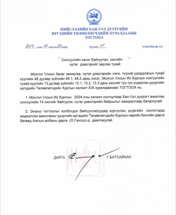 | №2 Хан-Уул дүүргийн иргэдийн Төлөөлөгчдийн Хурлын ээлжит XXI хуралдаан 2024 оны 05 дугаар сарын 28-ны өдөр хуралдаж, 15 санал авах байрны байршилд өөрчлөлт орууллаа.. |