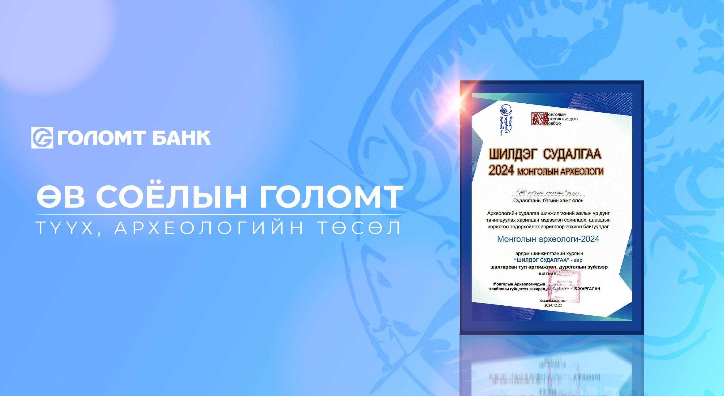 Монголын археологичдын холбоо болон Монголын Үндэсний Музей, 2024 оны Монголын археологийн нэгдсэн хурлаар Голомт банкны санаачилга болоод дэмжлэгтэйгээр гурав дахь жилдээ амжилттай хэрэгжиж буй "Өв соёлын голомт" төслийн хүрээнд хийгдсэн Булган аймгийн Сэлэнгэ сумын Ингэт толгойн дурсгалт газрын судалгаа-г шилдэг судалгаа төрөлд дэд байрт шалгарууллаа.