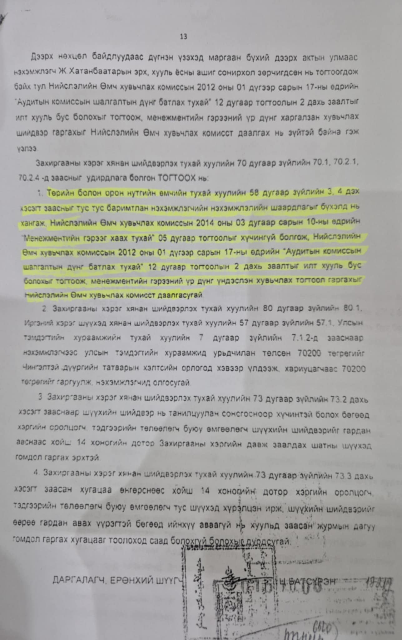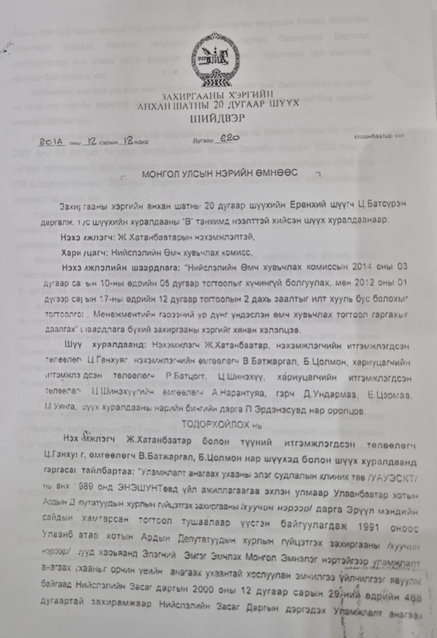 Эрхэм Ерөнхийлөгчөө, Монгол Улсын Үндсэн хуулийн 19-р зүйлийн 1-д “Төрөөс хүний эрх, эрх чөлөөг хангахуйц эдийн засаг, нийгэм, хууль зүйн болон бусад баталгааг бүрдүүлэх, хүний эрх, эрх чөлөөг зөрчихтэй тэмцэх, хөндөгдсөн эрхийг сэргээн эдлүүлэх үүргийг иргэнийхээ өмнө хариуцна” гэж заасны дагуу арга хэмжээ авч, УДШ-ийн шийдвэрийг хэрэгжүүлэхэд хуулийн хүрээнд дэмжлэг үзүүлнэ үү хэмээн танаас дахинтаа хүсэж байна.