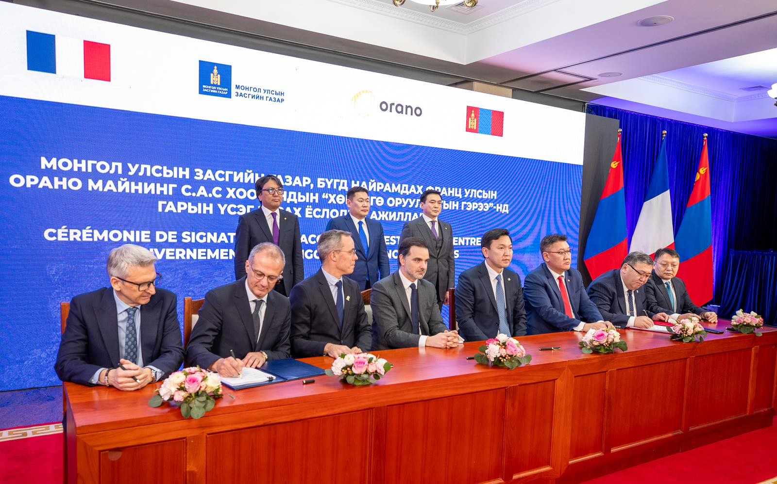 Монгол Улсын Засгийн газар Бүгд Найрамдах Франц Улсын “Орано Майнинг” энгийн хувьцаат компанитай хөрөнгө оруулалтын гэрээнд гарын үсэг зурах ёслолын ажиллагаа өнөөдөр боллоо. Гэрээнд Монголын талаас Монгол Улсын сайд, Засгийн газрын Хэрэг эрхлэх газрын дарга Н.Учрал, Сангийн сайд Б.Жавхлан, Аж үйлдвэр, эрдэс баялгийн сайд Ц.Туваан, “Эрдэнэс Монгол” ХХК-ийн гүйцэтгэх захирал С.Наранцогт нар, Францын талаас Бүгд Найрамдах Франц Улсын Европ, гадаад хэргийн сайдын дэргэдэх Гадаад худалдаа, хилийн чанад дахь иргэдийн асуудал эрхэлсэн сайд Лурон Сэн-Мартан, “Орано” группийн гүйцэтгэх захирал Никола Маас, “Орано майнинг” компанийн гүйцэтгэх захирал Завье Сэн Мартайн Тийе, “Бадрах Энержи” компанийн ерөнхий менежер Марк Мелеард нар тус тус гарын үсэг зурж гэрээг баталгаажууллаа.