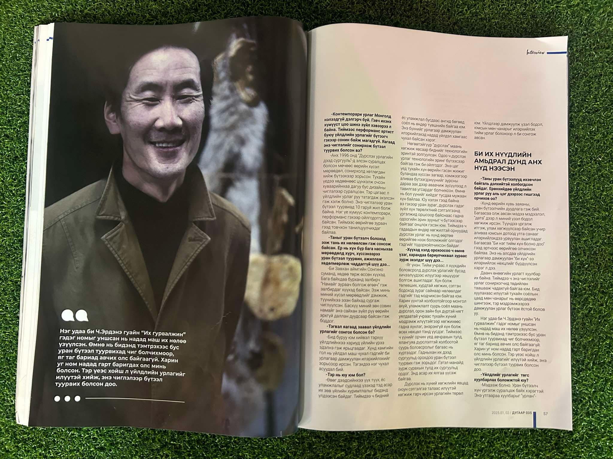 Хамгийн гэгээлэг, оюунлаг эрхмүүдийг танилцуулж, залуусыг дэмжиж, улс төрийн даацтай ярилцлагуудыг уншигчдадаа хүргэдэг “Interview” сэтгүүлийн 035 дахь дугаар уншигчдын гарт хүрсэн. “Ган үзэг-2024” наадмын шилдэг сэтгүүлээр шалгарсан “Interview” сэтгүүлийн энэ удаагийн дугаарт Соёлын гавьяат зүтгэлтэн, зохиолч, яруу найрагч Г.Аюурзана, “Өнөөдөр” сонины бизнес, гадаад бодлого хариуцсан орлогч эрхлэгч Б.Баярмагнай, “Урлах эрдэм” дээд сургуулийн багш С.Ганзүг нарын ярилцлага багтжээ. Тэдний ярилцлагаас онцлох таван эшлэлийг хүргэж байна.