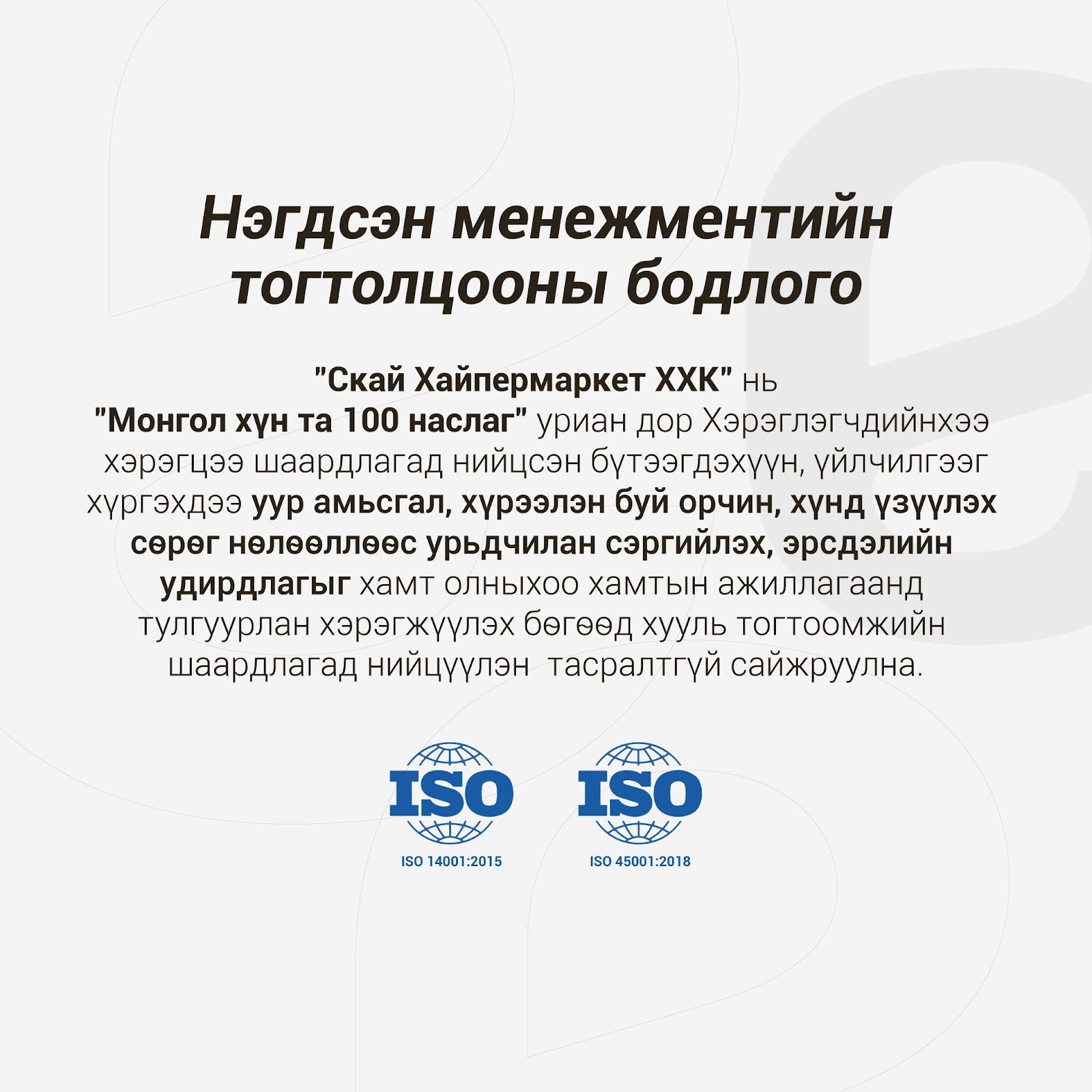 Скай Хайпермаркет ХХК нь 2024 оны 1 дүгээр сарын 1-ний өдрөөс Нэгдсэн менежментийн тогтолцоо буюу Байгаль орчны менежментийн тогтолцоо ISO 14001:2015, Хөдөлмөр эрүүл мэнд, аюулгүй байдлын ISO 45001:2018 олон улсын стандартыг нэвтрүүлэхээр ажиллаж байгаа билээ. Энэхүү менежментийн зорилго бол бид Байгаль орчны болон Хөдөлмөрийн эрүүл мэнд, аюулгүй байдлын олон улсын стандартын шаардлагад нийцэж байгаа эсэхэд байгууллагын хэмжээнд хяналт тавьж, баталгуужуулах, байгууллага өөрийн үйл ажиллагаанаас байгаль орчинд үлдээх ул мөрийг бууруулах, ажилтнуудын сэтгэлгээнд байгаль орчныг хамгаалах хандлага өөрчлөлт, эдийн засгийн хэмнэлтийг бий болгох, ажилтныг үйлдвэрлэл, үйлчилгээний сөрөг хүчин зүйлсийн нөлөөлөлд өртөхөөс урьдчилан сэргийлэх үйл ажиллагааны гүйцэтгэлийг нэмэгдүүлэх, тасралтгүй сайжруулахад дэмжлэг үзүүлэх, хэрэгжүүлэх, хадгалахад оршиж буй юм.